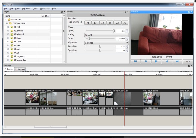 Vidiot is a home video editor that is easy to use. It supports operations like compositing, scaling/rotating, adding transitions, trimming, etc. 64 Bit available.