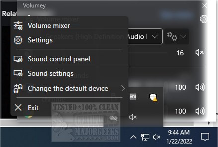 Volumey can be set up with global hotkeys to control the volume of any application, the volume of the current output device, mute the current output device, and change your default output device to another active device. You can also set an active output device as the default by selecting it in the tray icon context menu. It features on-screen display notifications and allows you to change the volume by hotkeys. There is also an in-app volume mixer that can be opened via global hotkey or by clicking the tray icon.