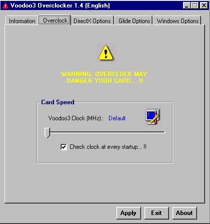 With Voodoo3 Overclocker you can overclock and optimize your 3dfx card. It works with all Voodoo3 models.