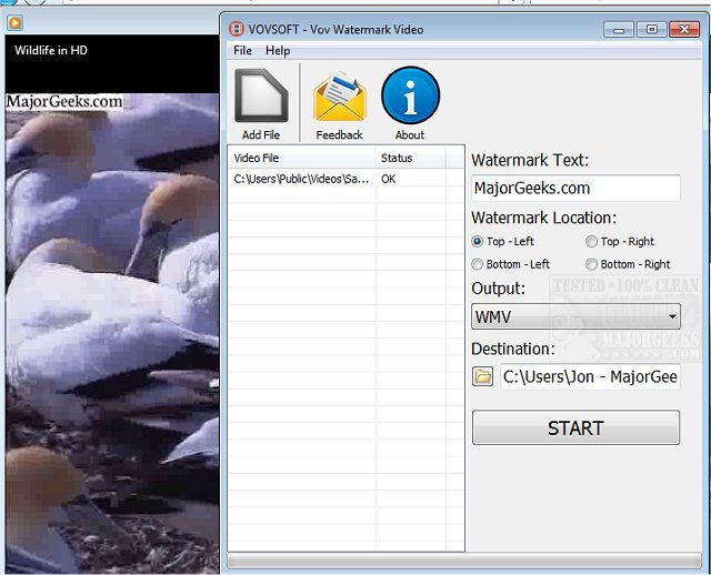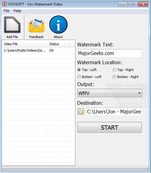 Keep your videos protected by inserting watermark text into the top-left, top-right, bottom-left, or bottom-right of the video. Vov Watermark Video supports drag n' dropping of files as well as the ability to change the destination folder, which by default is the desktop folder. This is not a complex app at any stretch and includes no options for changing the size of the text placed on the video or the color. There doesn't appear to be a character limit, however.