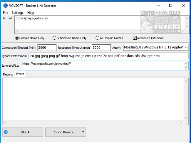 With VOVSOFT Broken Link Detector, you can check the domain name, subdomain name, or all domain names. You also have the option of a recursive scan. If you're an advanced user, you can access extra options to manage connection timeout, response timeout, user-agent, ignored extensions, and ignored URLs.