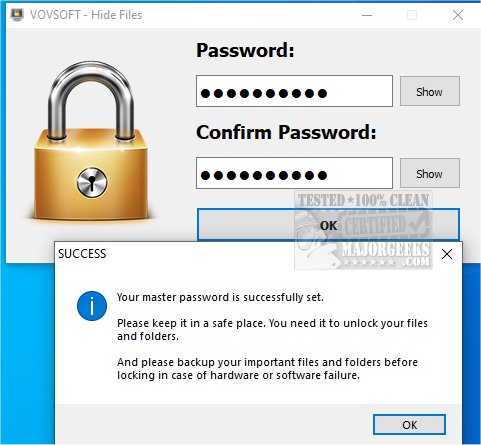 VOVSOFT Hide Files helps keep your files secure and only accessible with a password. Once you open the application for the first time, you need to set a master password, which you will need to enter whenever you use it later.