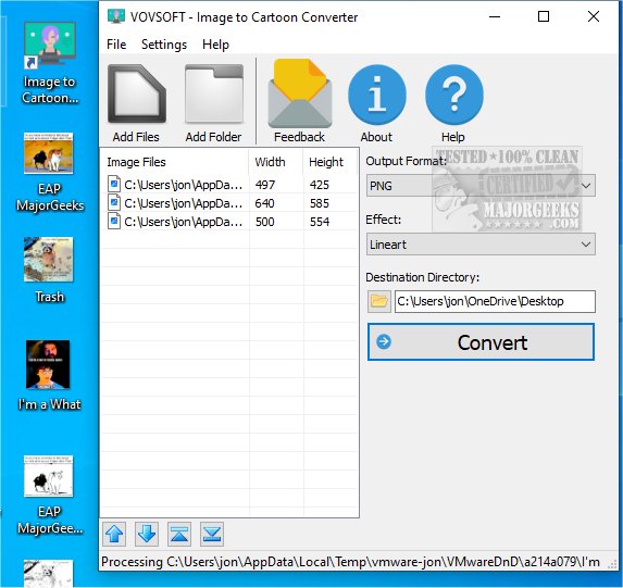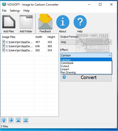 VOVSOFT - Image to Cartoon Converter gives you a quick and easy way to apply a cartoon-like effect to your images. With this tool, you can transform personal pictures into eye-catching and exciting designs suitable for comic books, cartoons, or hand-drawn art. Additionally, the software supports batch processing, allowing you to convert multiple images at once.