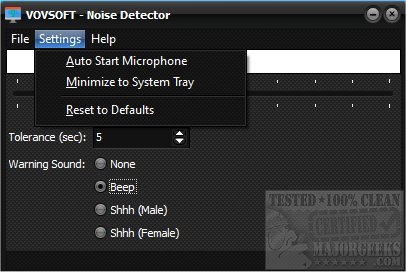 VOVSOFT Noise Detector has a noise threshold level that can be modified via the slider. You can also change the tolerance time (in seconds). It includes three warning sounds to choose from: a beep and a "shhh" spoken by a male or a female. The warning sound is played when the noise level gets too high, exceeding the threshold.
