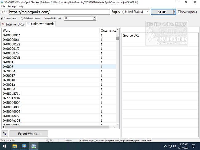 VOVSOFT Website Spell Checker ensures you'll never be caught with embarrassing spelling mistakes on your site. To utilize the VOVSOFT Website Spell Checker, input your website address into the designated "URL" field. Afterward, click on the "Start" button. The software will then identify and display spelling errors in the "Unknown Words" tab. Some words will flag that are not misspelled, like the error codes (as shown in screenshot number two).