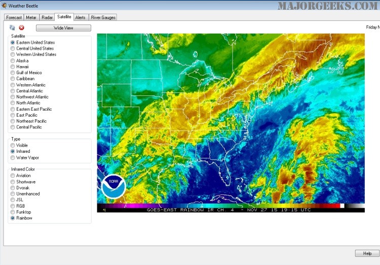 Satellite Tab: Retrieves graphical satellite images from NOAA for Pacific and Atlantic ocean regions. Shows current satellite conditions for the United States and many surrounding regions.