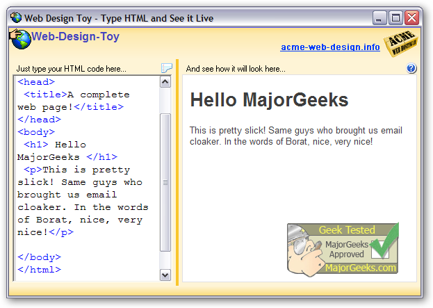 Web Design Toy provides a deceptively simple split-window layout. Whatever HTML is typed in the editor window is instantly shown in web-page form in the display window. The result is an imediate feedback learning tool - a perfect companion for any HTML course or learning tutorial.