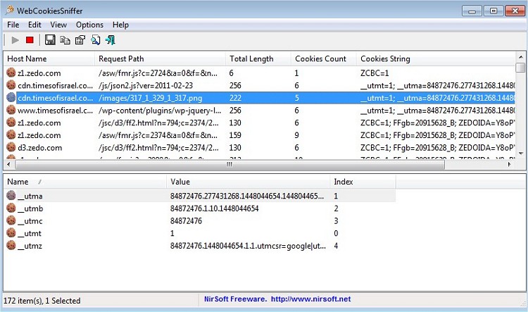 WebCookiesSniffer is a packet sniffer tool that captures all Web site cookies sent between the Web browser and the Web server and displays them in a simple cookies table.