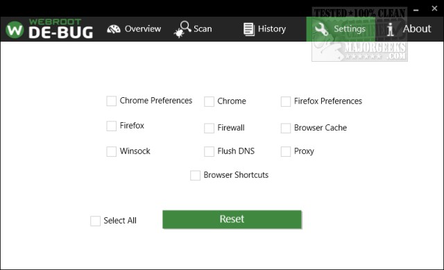 Webroot DE-BUG is portable and simple to use. From the main window, you will see an overview as well as options to Scan, History, Settings, and About. The settings aren't well explained although a few options are apparent including Winsock, Browser Shortcuts, Flush DNS, Proxy, and Firewall. Our guess would be to use the Select All option here.