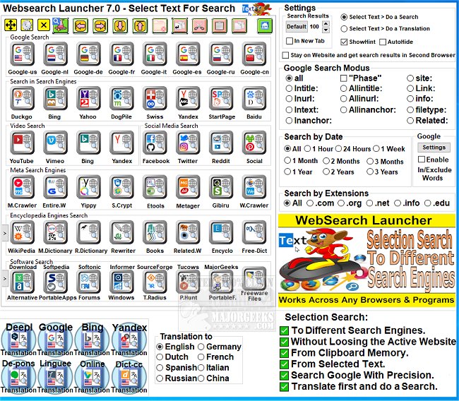 Websearch Launcher will allow you to perform Web searches via multiple search engines. This ability means you can select text on websites or programs. Then you can perform a search or translations from different search engines, including Google, Bing, Yahoo, Yandex, Duckduckgo, and many others. Just choose the one that suits your needs.