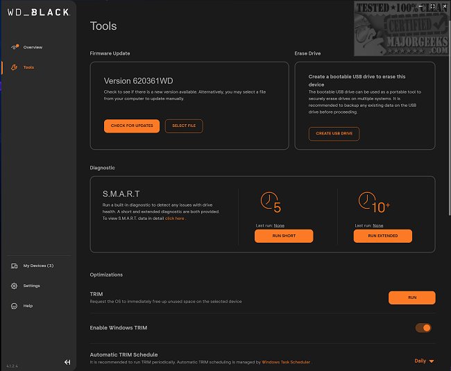 It has a friendly graphical interface and includes tools for analysis of your drive, including the disk model, capacity, firmware version, SMART attributes, and can even update your firmware. You can also manage your TRIM from WD SSD Dashboard, a factor we all now know the importance of for performance and lifespan.