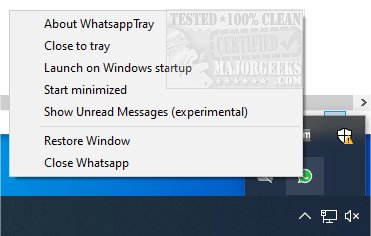 WhatsappTray allows you to have a quick systray launch option that also offers several right-click menu features. And since you can minimize Whatsapp to the systray without closing it and show unread messages (experimental), make it a streamlined addition for anyone who utilizes Whatsapp.