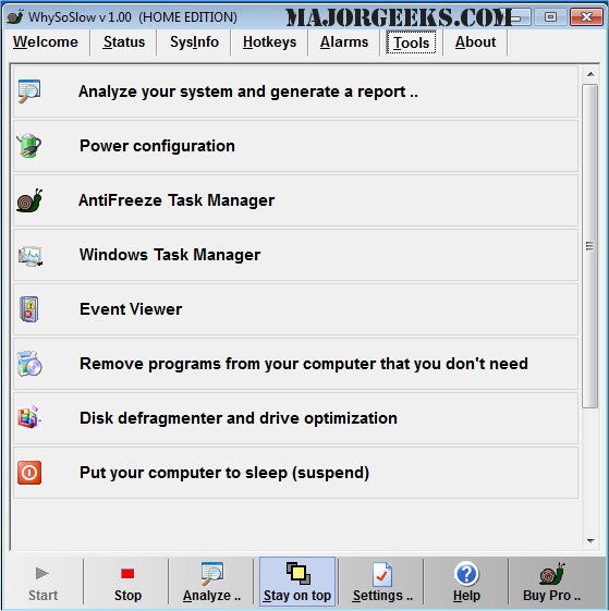 WhySoSlow will also let you configure alarms that trigger when specific criteria have been met. This can be ideal for monitoring CPU temperatures, fan speeds, memory usage, for example. It also includes tools to address these problems as well.