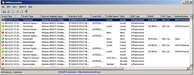 WifiHistoryView will quickly display the following wireless connection/disconnection event information: The date/time that the event occurred, the network name (SSID), profile name, network adapter name, BSSID of the router/Access Point, local MAC address, and more.