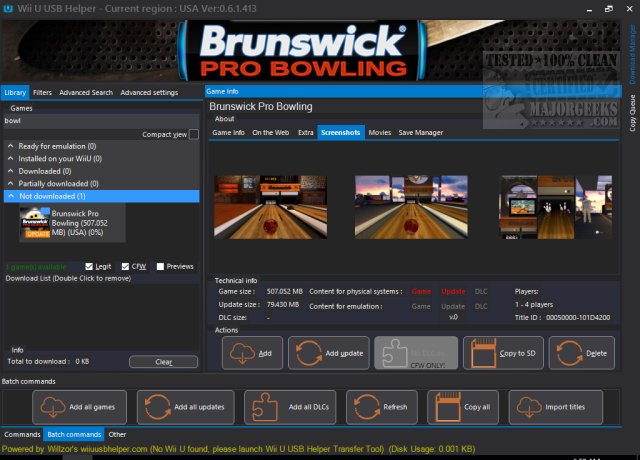 Overall, the interface is well laid out considering the amount of information here. It reminds us a little of Steam or other game downloading clients, so that's a good thing. You can view your library, apply filters, do an advanced search and change advanced settings. Game info includes general info, on the web, extra, screenshots, movies, and save manager. You can add a desktop shortcut, download or play a game, add, delete or even copy to SD. You can also find batch commands at the bottom. Finally, if you made a mistake, you can change the game directory, download folder, and region. Because we don't have a WiiU or 3DS here, we weren't able to download and run any games, but we get the point.
