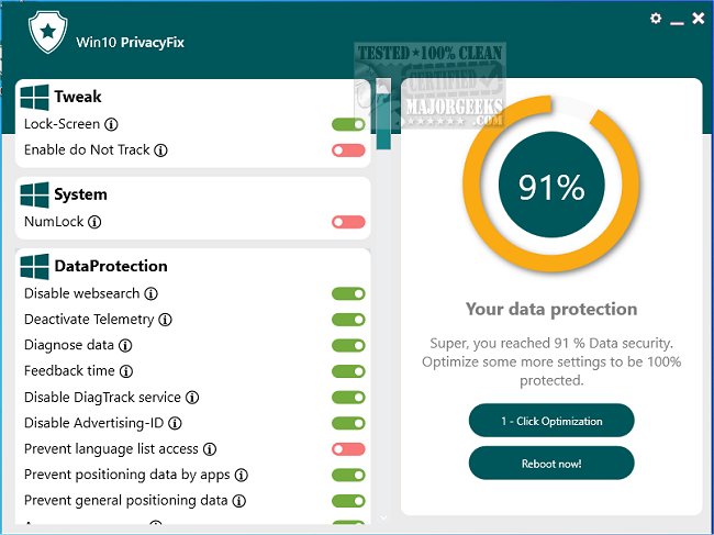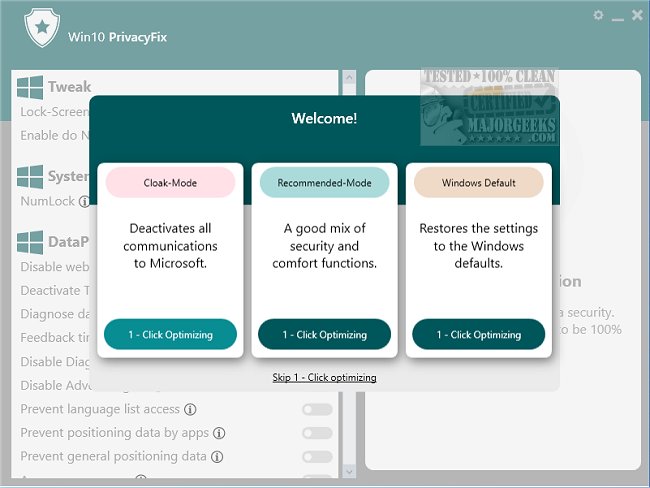 Win10PrivacyFix is a tool that gives you more control over the data sent to Microsoft, which helps you protect your privacy by preventing unwanted information from being transmitted. It optimizes Explorer and background services to help you regain security and control of your Windows 10 machine.