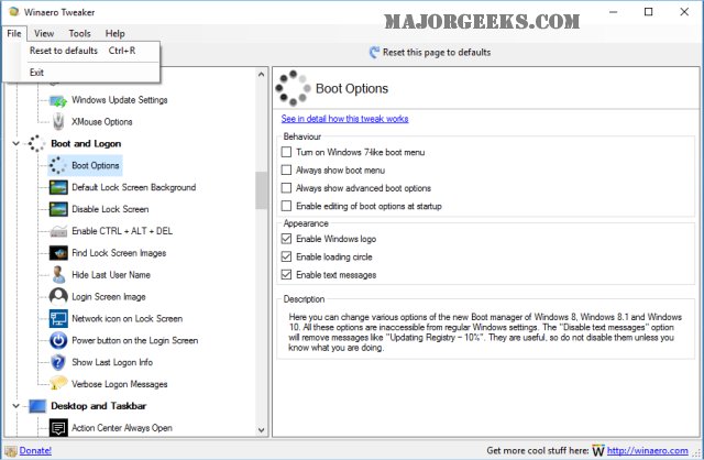 From here, you scroll on the left side and pick your way through the many categories and subcategories. These main categories include Bookmarks, Appearance, Advanced Appearance, Behavior, Boot and Logon, Desktop, and Taskbar. Followed with Context Menu, Settings and Control Panel, File Explorer, Network, User Accounts, Windows Defender, Windows Apps, Privacy, Tools, and Get Classic Apps. Each category or subcategory has a description of the tweak you're looking at and, in some cases, a link to find more in-depth information.