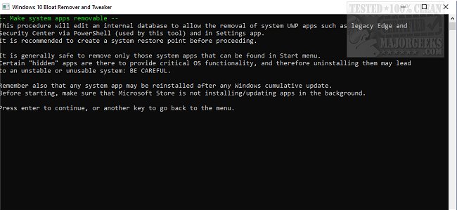 The intention is to have a more efficient system by trimming down unnecessary Windows 10 apps and features. It is simple to use and contains a menu with 14 operations. All you need to do is select one and hit enter. Then, Windows 10 Bloat Remover and Tweaker provides an explanation of the operation you are about to undertake. It will also give you suggestions to make sure the fix works properly. All the key bloat points are represented.