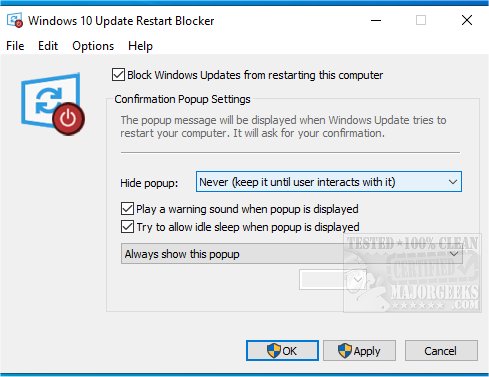 Windows 10 Update Restart Blocker provides options to delay forced restarts triggered by the installation of Windows updates and allows users to choose how often they get bothered with notifications of a pending restart.