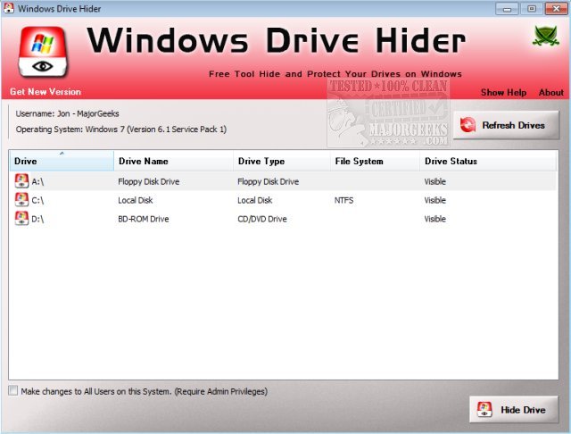 Our Drive Hider tool makes it easy for you to quickly hide/unhide any Drive with just a click. You can also choose to hide it from the current user only or from all users on the system.