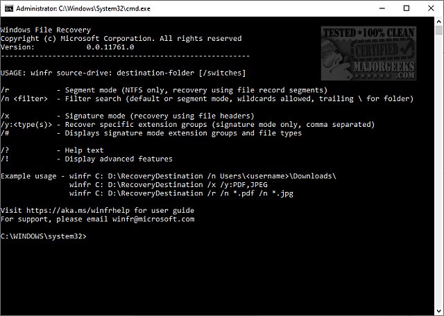 Windows File Recovery is a command-line tool. On the first run, you will see a list of commands:
