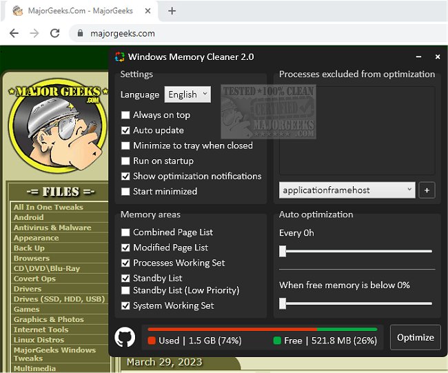 This little app stands in when programs do not release the memory they have used. This fact can slow down your machine. You do have the option to restart, but why waste time going through the process? Windows Memory Cleaner will clean your memory, allowing you to continue working without the need to restart your machine.