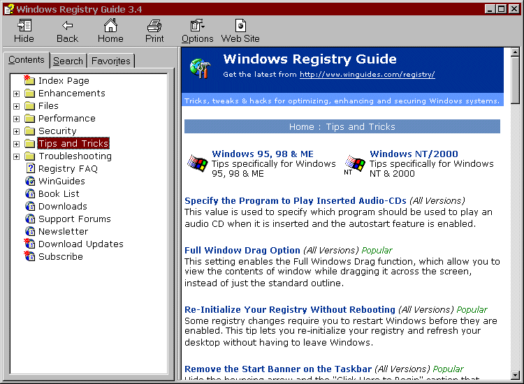 The Windows Registry Guide is a Windows help file that reveals all the best tweaks, tricks, and hacks for the Windows 95, 98, Me, NT, 2000 and XP Registries. The Registry is a database used to store settings and options for the 32-bit versions of Microsoft Windows. It contains information and settings for all of the PC's hardware, software, users, and preferences. Whenever a user makes changes to Control Panel settings, file associations, system policies, or installed software, the changes are reflected and stored in the Registry.