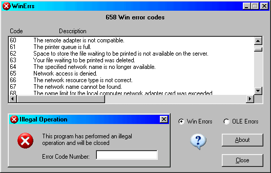 Did you ever get an 'Illegal Operation' or 'Page Fault' error message and wonder what it meant? WinErrs is a database of 1,554 Windows error codes and their definitions. These codes are extracted directly from Microsoft Windows and are their descriptions. With over 1,500 error codes they certainly seemed prepared for the worst.