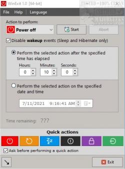 WinExit is displayed from a straightforward interface that lends itself to a fast setup of the countdown to your selected action. There are also 6 quick actions available that allow you to shut down, hibernate, lock, etc., immediately.