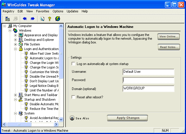 The WinGuides Tweak Manager allows you to take complete control of your Windows system and registry with access to hundreds of powerful tweaks and hidden settings. Using the intuitive software interface you can optimize, enhance and secure every aspect of your computer, from your desktop to Internet connection. The unique live update feature ensures that you always have access to the latest tweaks for your Windows system.