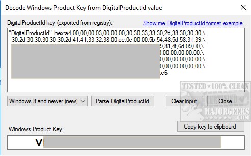 Once you've entered the DigitalProductId, select your Windows version from either up to Windows 7 or Windows 8 and newer, then click Parse DigitalProductId and your key will be shown at the bottom. You can clear the input to find another key or again, copy the key to your clipboard.