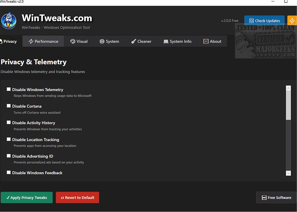 WinTweaks is a powerful, comprehensive Windows optimization tool that gives you full control over your operating system. With an intuitive dark-themed interface and 80 carefully selected tweaks, WinTweaks helps you enhance performance, protect your privacy, customize the appearance, and clean unnecessary files.