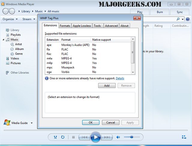 WMP Tag Plus is a plug-in that seamlessly integrates into Windows Media Player, providing library and tagging support for additional music formats including Ogg Vorbis, FLAC, WavPack, Monkey's Audio, Musepack, and MPEG-4.