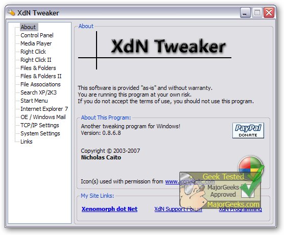 XdN Tweaker is a free tweaking program for Windows XP, Windows Server 2003 / 2003 R2, Windows Vista, Windows Server 2008, Windows Server 2008 R2, and Windows 7.