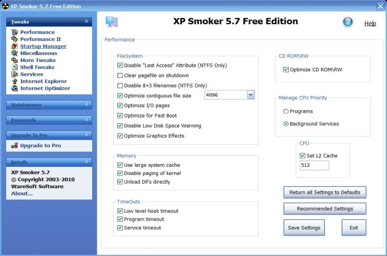 Improve the performance for your computer drastically. You can also stop and disable useless services in Windows XP. And in the end, you will reduce subsystem bottlenecks, increase application and boot speeds, and ultimately increase the stability of your system. Simple for Beginners. Powerful for Experts. And it really works! XP Smoker Pro is perfect for game enthusiasts, heavy surfers, and PC users on a budget. It is the simple and straightforward way to tweak your system to peak performance. XP Smoker Pro also includes a powerful Internet Optimizer that runs a series of tests to improve your Internet connection for smoking fast surfing no matter what connection speed you have! Whether you use a dialup, cable, DSL, or satellite connection, XP Smoker Pro can increase your browsing speed by as much as 100 percent! XP Smoker Pro also includes 94 security tweaks to really tighten up your system. It also includes the new toolbox with 3 powerful tools and 3 timesaving tools. XP Smoker Pro now includes DriveFreeze a new feature to lock down your removable storage devices so nobody can use them with your permission. You can lock down USB drives, CD-ROM/DVD drives, and floppy drives.