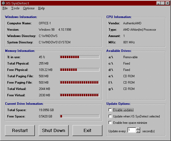 XS SysDetect detects aspects of your computer, primarily your memory and primary hard drive usage. This information can be displayed at all times in the default minimize mode on your task bar and can be updated at varying frequencies. XS SysDetect also has other useful features.