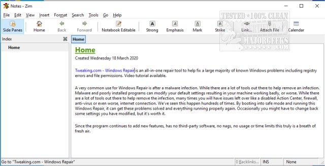 Each page can be directed to contain links to other pages, simple formatting, and images. THe produced pages are stored in a folder structure (like in an outliner), and they can have attachments as well. Creating a new page with Zim Desktop Wiki is as easy as linking to a nonexistent page. All data is stored in plain text files with wiki formatting. Various plugins provide additional functionality, including a task list manager, equation editor, tray icon, and version control support.