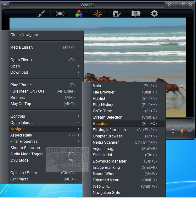 Zoom Player Free's fullscreen navigation interface is based on a simple 5-Key system (up/down/left/right/select). The 5-key system allows easy access and navigation to such interfaces as Media Library, File Browsing, Playlist, Color Control, Audio Equalizer, Chaptering, Play History, and more. The system's simplicity makes it ideal for users with no previous computer experience.