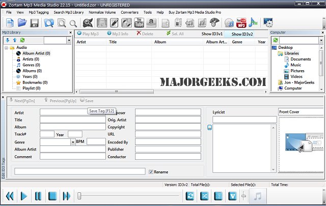 Zortam Mp3 Media Studio is an all-in-one Mp3 application that contains Mp3 ID3 Tag Organizer for searching and cataloging Mp3 files into an Mp3 library.