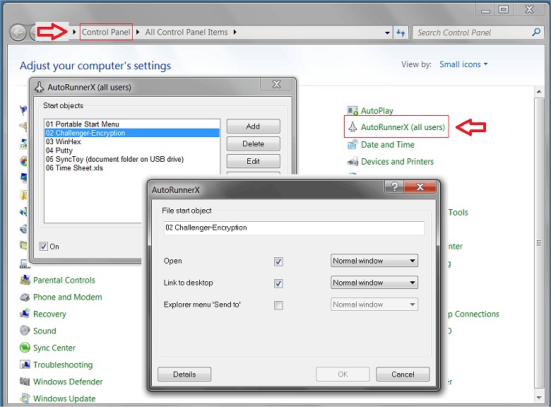 AutoRunnerX and AutoRunnerU are autorun-extensions for Windows that can open programs and files, when a USB flash drive or external hard disk to the computer is connected.