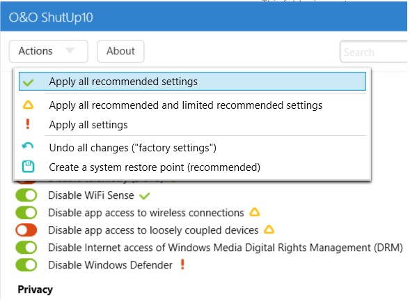 O&O ShutUp10 is a portable privacy tool that provides you with full control over which comfort functions in Windows 10 you choose to use and how far data gets shared.