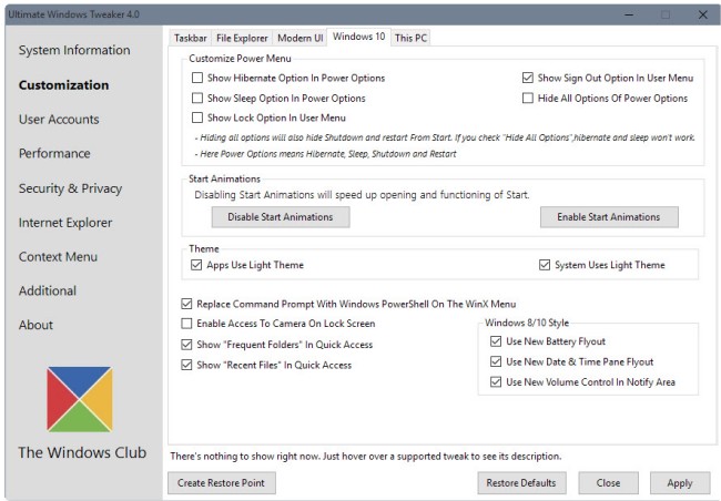 Ultimate Windows Tweaker for Windows 10 is an all-in-one tweaking solution that comes packed with over 200 tweaks to personalize and make the Windows 10 experience yours.