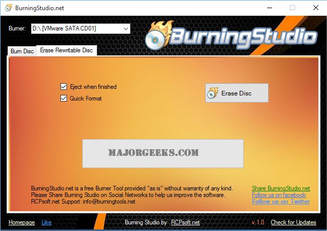BurningStudio is a free Portable, easy-to-use burning software which allows users to write all types of files such as digital photos, pictures, archives, documents, music and videos to CDs, DVDs and Blu-ray Discs.