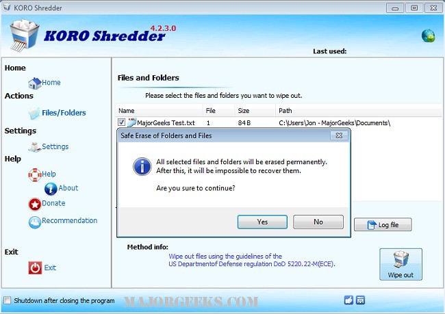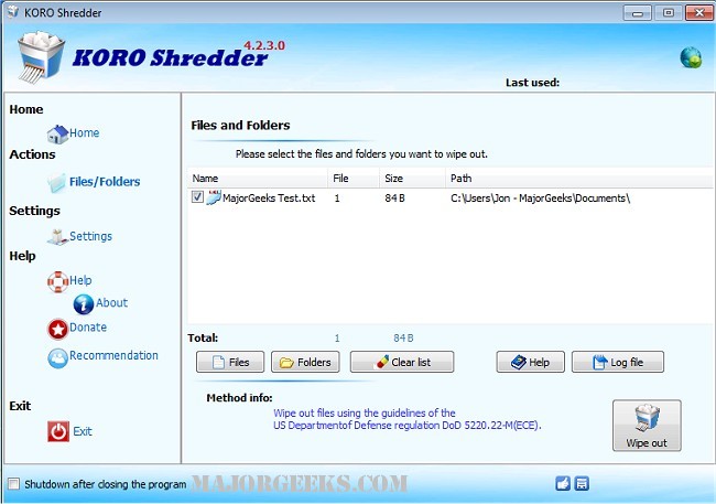 KORO File Shredder is an easy to use program for making sure your sensitive data is rendered non-recoverable, it will overwrite the selected data multiple times depending on the method selected.