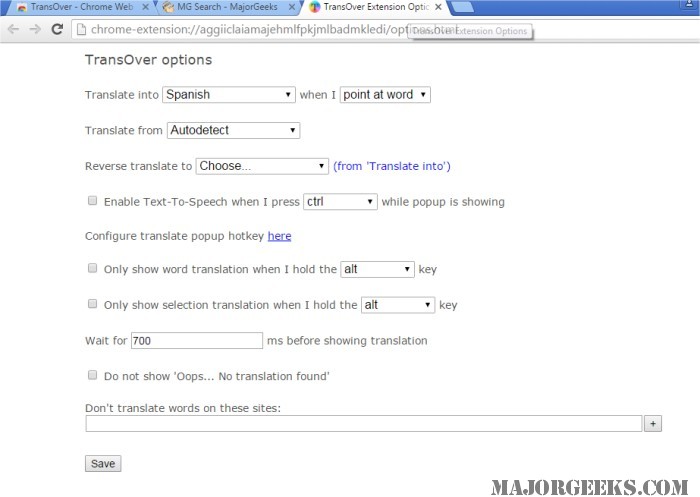 TransOver for Chrome TransOver for Chrome will translate words or sections of text by simply pointing or clicking the area you wish to translate.