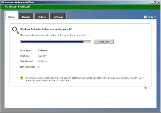 Windows Defender Offline is a standalone version of Windows Defender to detect malicious and other potentially unwanted software.
