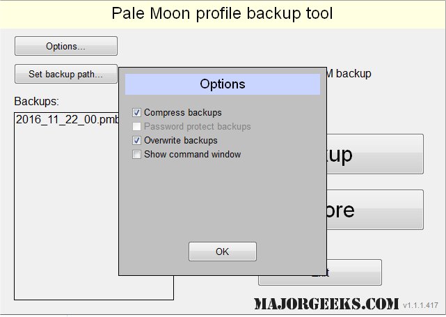 Pale Moon Profile Backup Tool is a straightforward way to conveniently back up Pale Moon browser profiles.