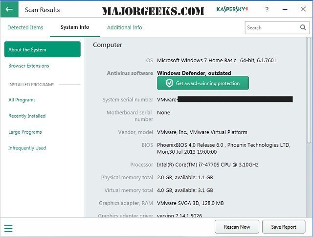 Kaspersky System Checker examines your system for any software vulnerabilities, malware, and viruses as well as providing hardware details.