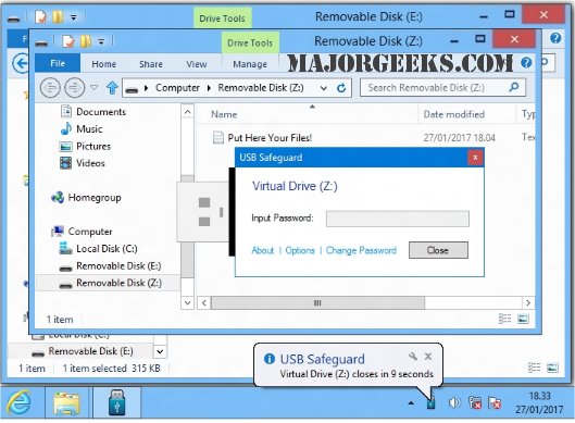 USB Safeguard is a portable software utility that allows you to protect your private files with a password on your removable drive using the secure AES 256 bits key.