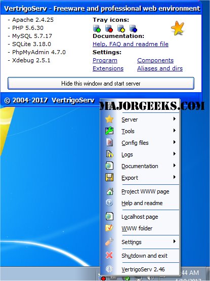VertrigoServ is an easy-to-install WAMP server package consisting of the current versions of Apache (HTTP web server), PHP (reflective programming language), MySQL (multithreaded, multi-user, SQL Database Management System), and more.